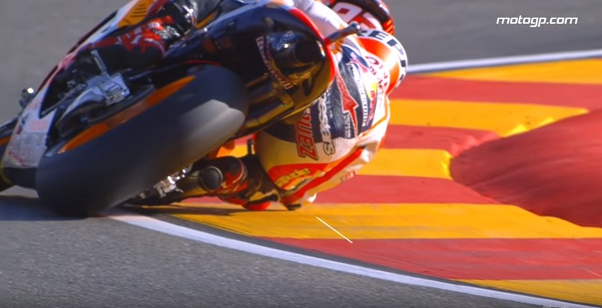 Bukan lagi lutut yang menjadi tumpuan ketika melibas tikungan, Marc menjadikan sikutnya sebagai tumpuan dan juga indikator kemiringannya ketika menunggang motor balap di sirkuit.