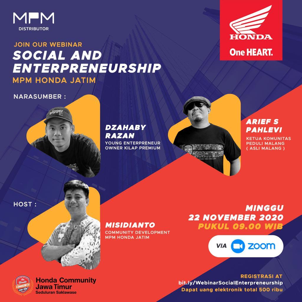 Seperti yang dilakukan pada minggu 22 November 2020 kemarin, MPM Honda Jatim mengadakan Webinar Social Dan Enterpreneurship.