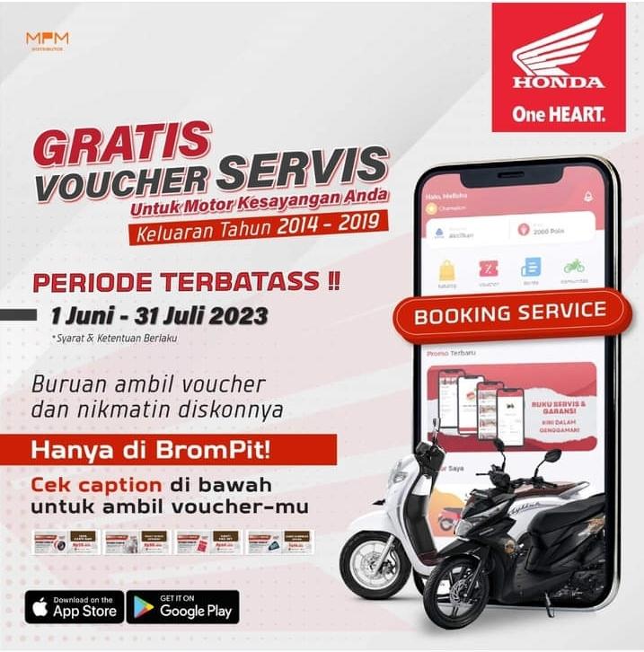 Bagi para pengguna motor Honda keluaran tahun 2014-2019, MPM Honda Jatim melalui aplikasi Brompit memberikan gratis voucher servis untuk anda konsumen setia Honda.