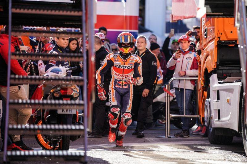 Marquez terjatuh di tikungan ke-13 pada tes hari pertama. Ia mengalami dislokasi bahu kanan.