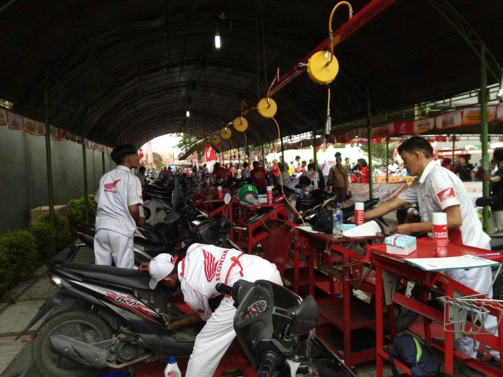 Program servis gratis sepeda motor Honda disambut antusias warga Palu yang mulai mengantri sejak pagi hari di jalan Juanda, Palu (4/11). Dengan didukung 38 mekanik Honda handal, sebanyak 335 unit sepeda motor Honda dari berbagai tipe mendapatkan servis gratis serta penggantian oli atau busi secara cuma-cuma.