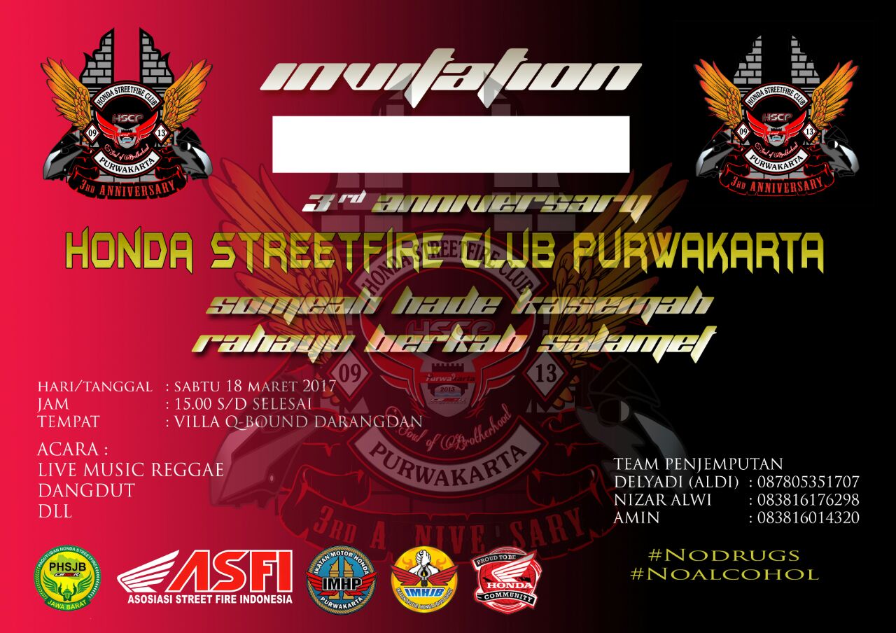 Nah untuk kawan-kawan anggota klub yang yang tergabung dalam paguyuban Ikatan Motor Honda Jawa Barat, kawan-kawan semua diundang untuk turut andil dalam acara 3rd Honda StreetFire Club Purwakarta yang akan digelar 18 Maret 2017 di Villa Q-Bound Darangdan Purwakarta.