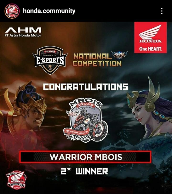 Itulah kalimat yang diucapkan oleh teman-teman Honda Community Jatim saat mengetahui bahwa Mbois Tim Warrior MPM Surabaya meraih posisi juara 2 di ajang Honda Community E-sports National Mobile Legend Competition 2020 yang diadakan oleh PT. Astra Honda Motor.