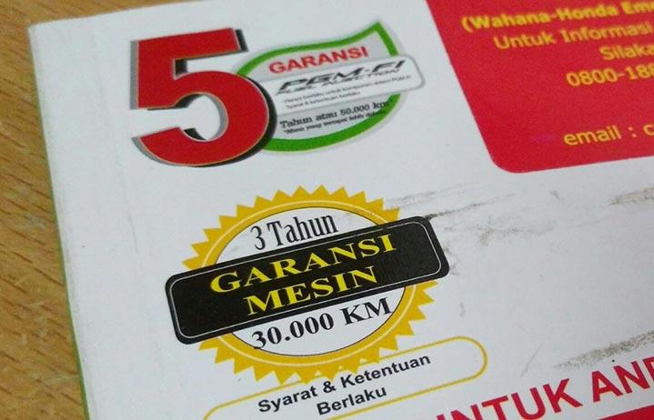 Pada garansi mesin yang diberikan adalah hingga tiga tahun atau 30.000 km, pada garansi mesin injeksi hingga lima tahun atau pada 50.000 km dan pada garansi rangka serta pada sistem kelistrikan hingga satu tahun atau 10.000 km pemakaian, itu semua tergantung mana yang dicapainya terlebih dahulu.