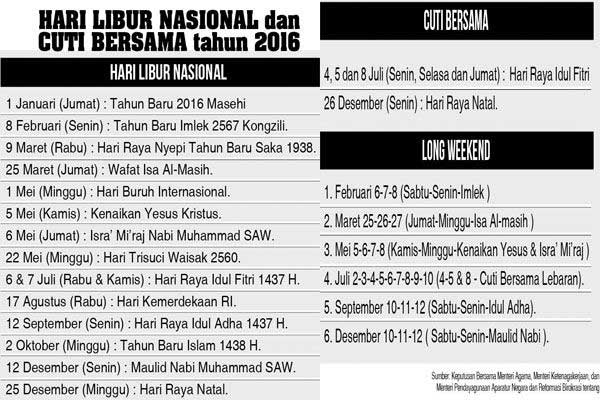 Perincian lengkapnya, sebanyak 15 hari libur nasional dan 4 hari cuti bersama. Jumlah libur nasional dan cuti bersama ini sejatinya sama dengan 2015. Namun bila dilihat lebih detail lagi, libur dan cuti bersama kali ini bertepatan dengan akhir pekan, sehingga kemungkinan besar bakal lebih panjang lagi.