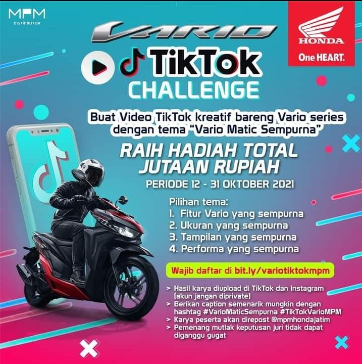 PT. Mitra Pinasthika Mulia (MPM Honda Jatim) distributor sepeda motor Honda wilayah Jatim & NTT memberikan wadah bagi kalian-kalian yang suka tiktok untuk mengeluarkan kreatifitas kalian dalam membuat video tiktok dengan mengikuti Vario TikTok Challenge dengan tema "Vario Matic Sempurna".