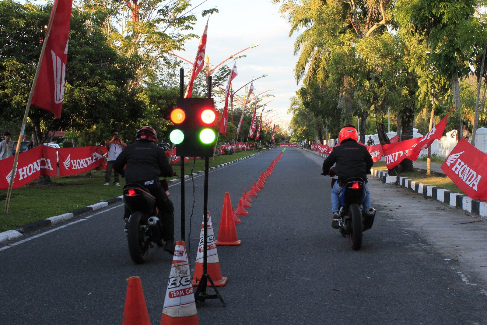 Perdana, seorang bikers dari Kalimantan tercepat tunggangi The All New Honda Supra GTR150 dengan waktu 10,06 detik pada event time trial Roadshow Honda Supra GTR 150 di Bundaran Besar Palangkaraya (8/7).